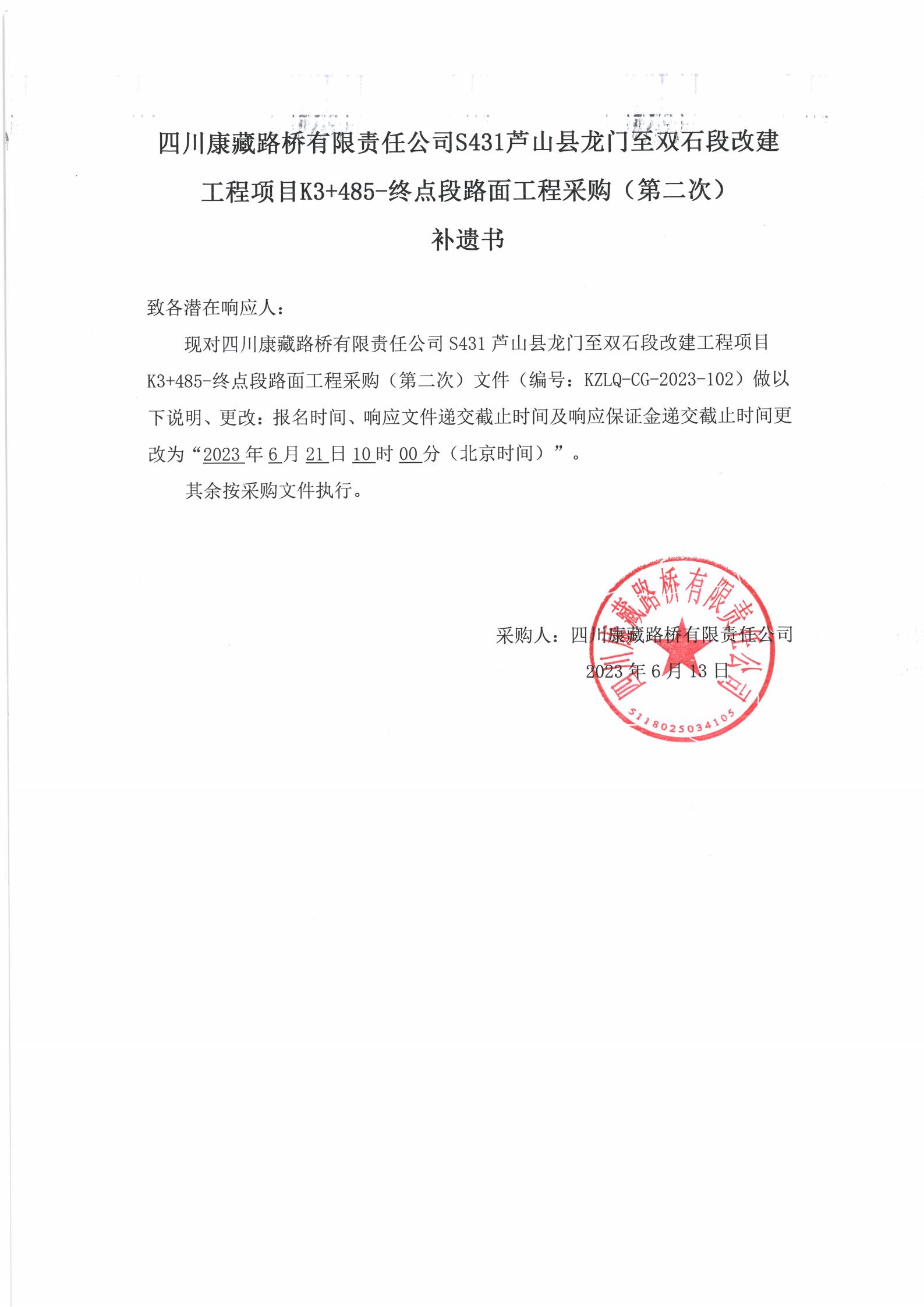 四川康藏路橋有限責(zé)任公司S431蘆山縣龍門至雙石段改建工程項(xiàng)目K3+485-終點(diǎn)段路面工程采購(第二次)補(bǔ)遺書