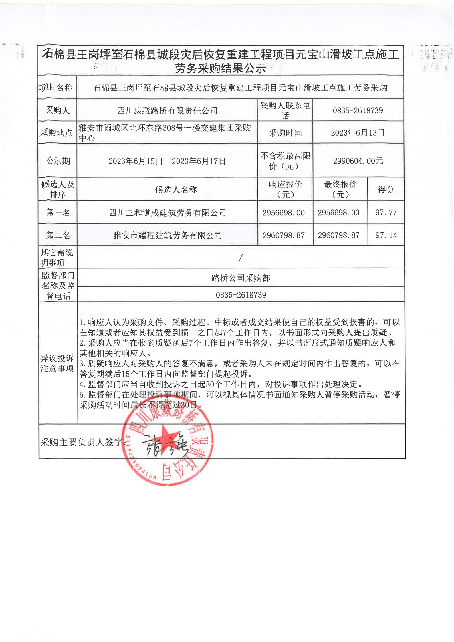 四川康藏路橋有限責任公司石棉縣王崗坪至石棉縣城段災后恢復重建工程項目元寶山滑坡工點施工勞務采購結(jié)果公示