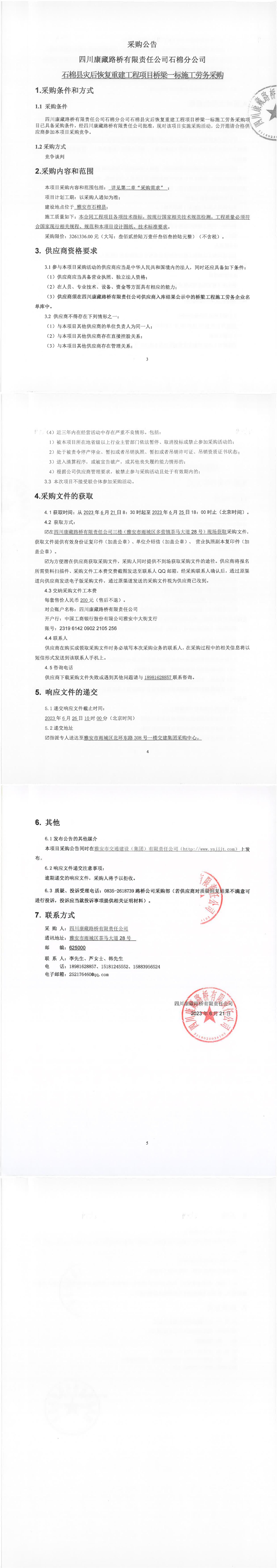 四川康藏路橋有限責(zé)任公司石棉分公司石棉縣災(zāi)后恢復(fù)重建工程項目橋梁一標(biāo)段施工勞務(wù)采購公告