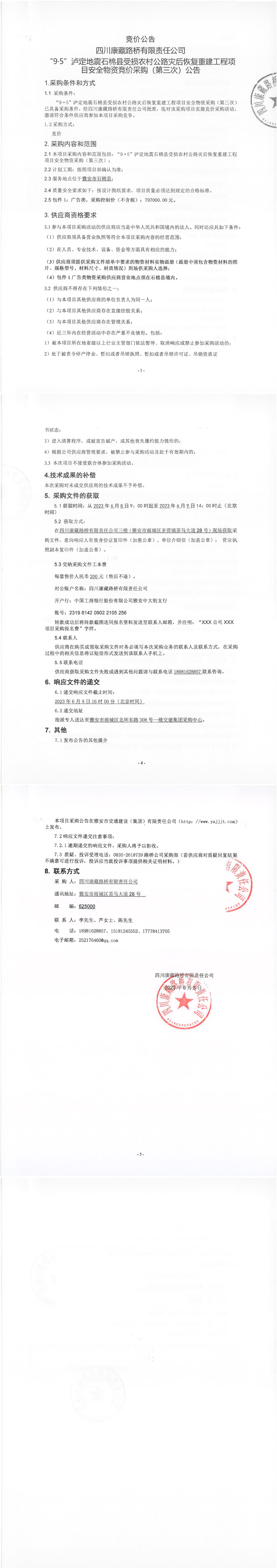 四川康藏路橋有限責任公司“9·5”瀘定地震石棉縣受損農(nóng)村公路災(zāi)后恢復重建工程項目安全物資競價采購(第三次)公告