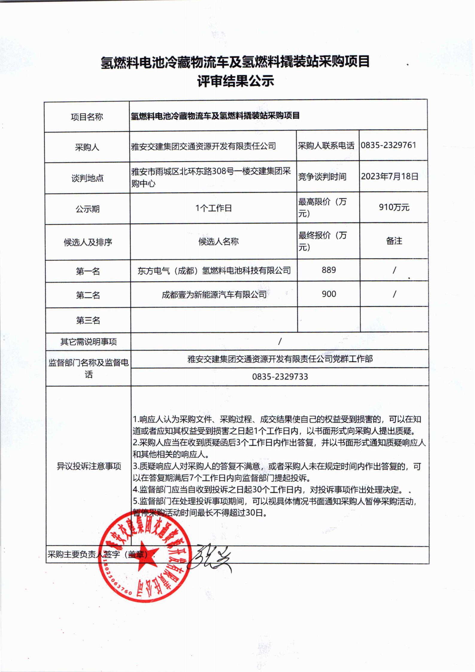 雅安交建集團(tuán)交通資源開發(fā)有限責(zé)任公司氫燃料撬裝站采購項(xiàng)目評審結(jié)果公示