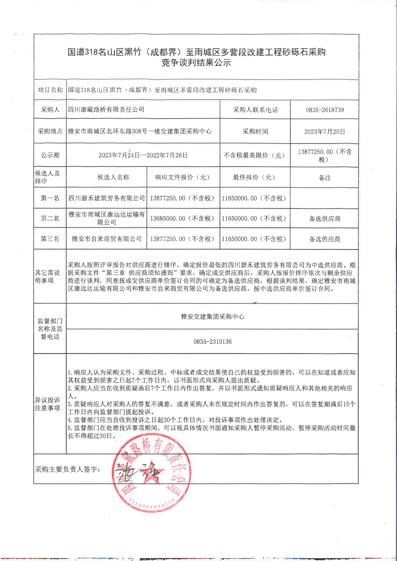 四川康藏路橋有限責任公司國道318名山區(qū)黑竹(成都界)至雨城區(qū)多營段改建工程砂礫石采購競爭談判結果公示