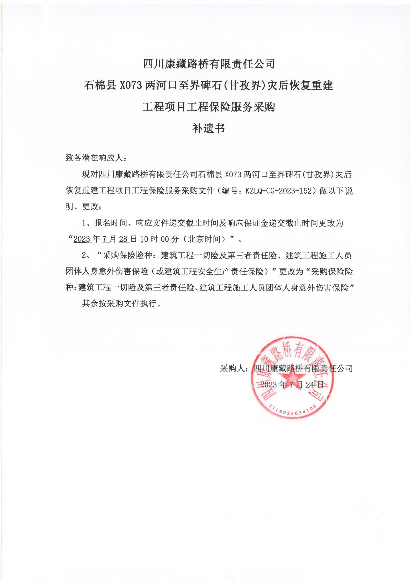 四川康藏路橋有限責(zé)任公司石棉縣X073兩河口至界碑石(甘孜界)災(zāi)后恢復(fù)重建工程項(xiàng)目工程保險(xiǎn)服務(wù)采購(gòu)補(bǔ)遺書