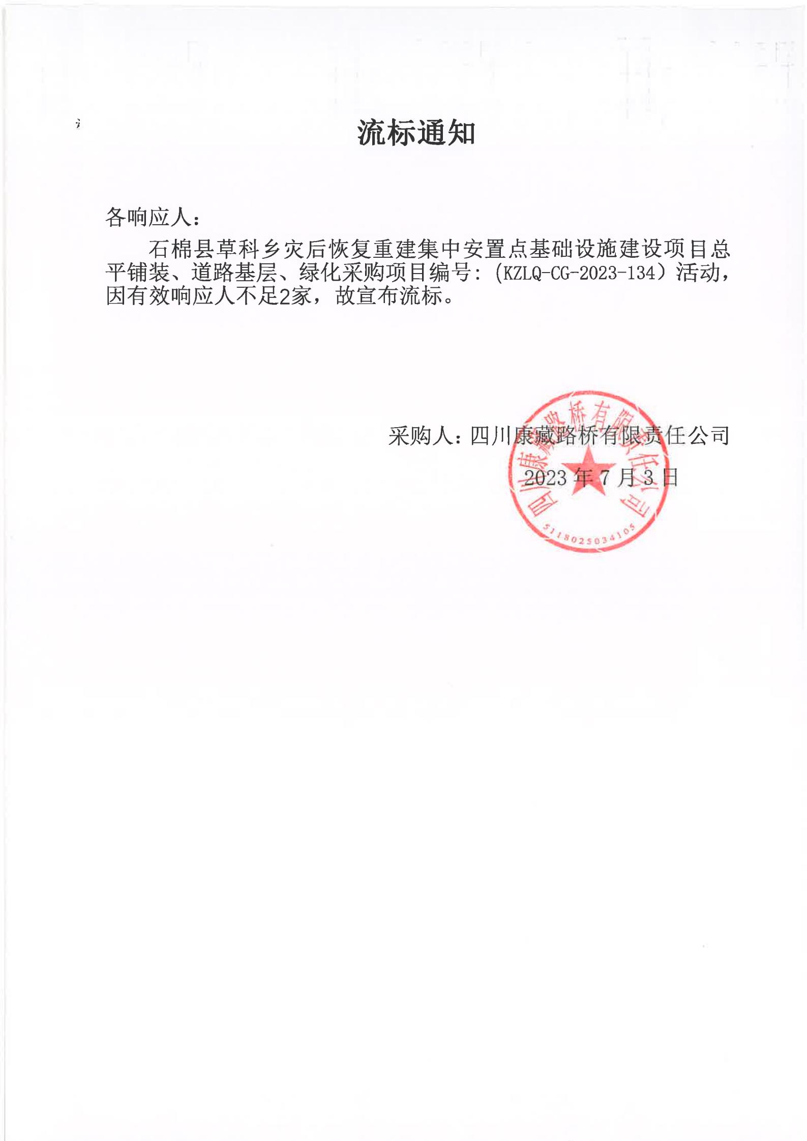 四川康藏路橋有限責任公司石棉縣草科鄉(xiāng)災后恢復重建集中安置點基礎設施建設項目總平鋪裝、道路基層、綠化采購流標通知