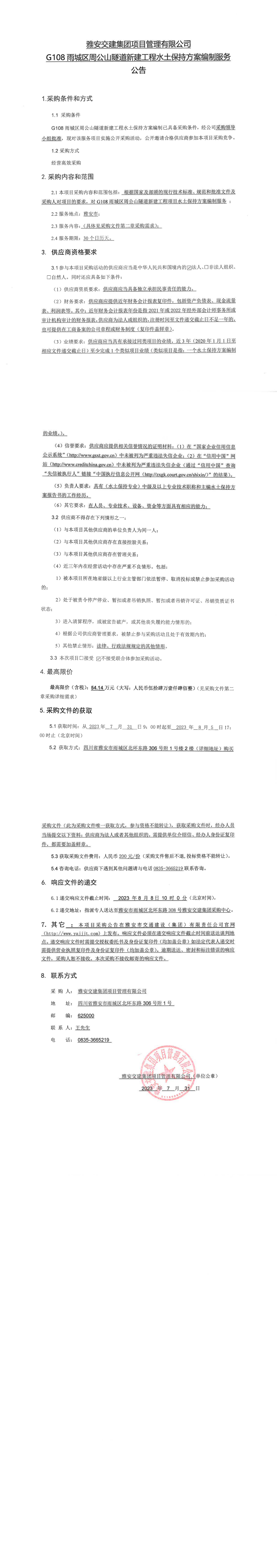 雅安交建集團項目管理有限公司G108雨城區(qū)周公山隧道新建工程水土保持方案編制服務(wù)公告