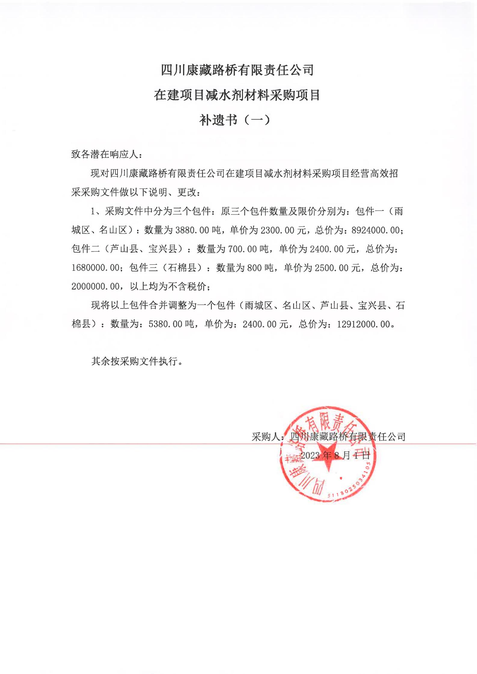 四川康藏路橋有限責(zé)任公司在建項(xiàng)目減水劑材料采購(gòu)項(xiàng)目補(bǔ)遺書(shū)(一)