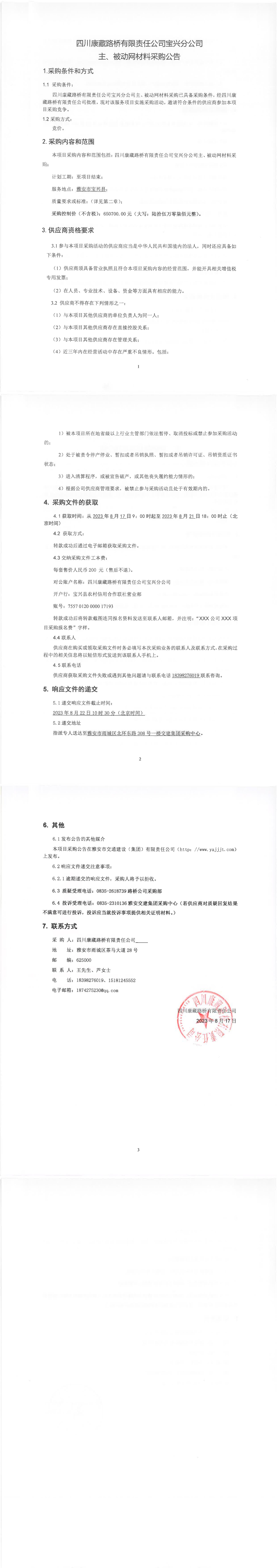 四川康藏路橋有限責任公司寶興分公司主、被動網(wǎng)材料采購公告