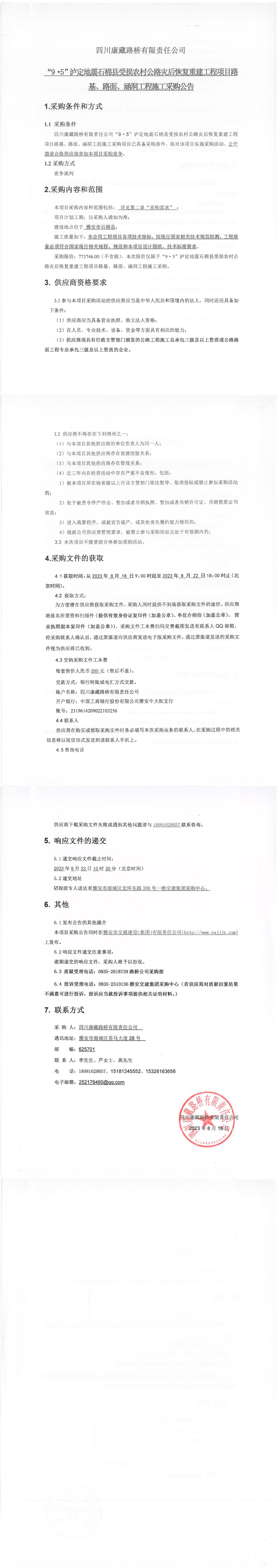 四川康藏路橋有限責(zé)任公司“9·5”瀘定地震石棉縣受損農(nóng)村公路災(zāi)后恢復(fù)重建工程項(xiàng)目路基、路面、涵洞工程施工采購(gòu)公告