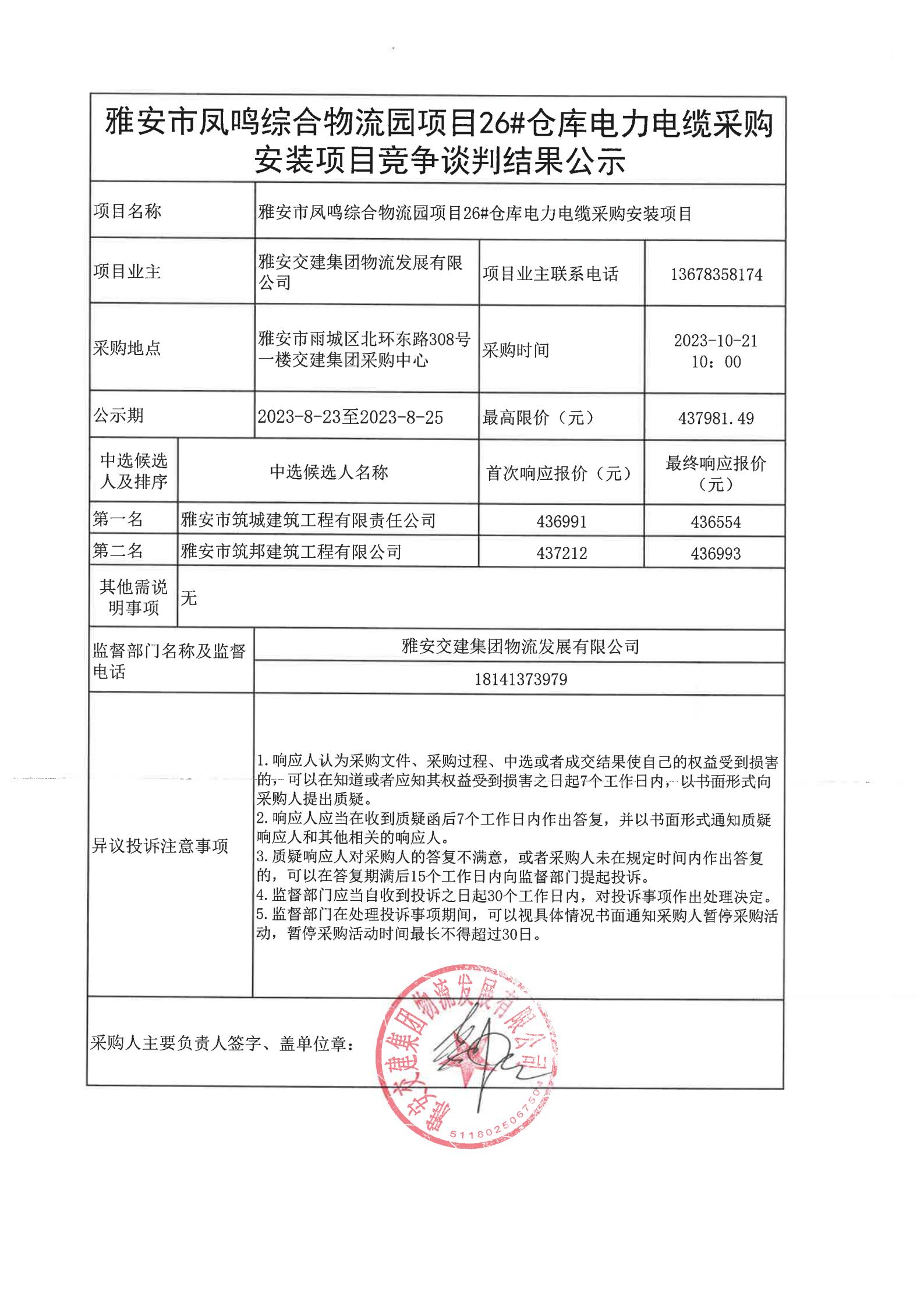 雅安交建集團物流發(fā)展有限公司雅安市鳳鳴綜合物流園項目26#倉庫電力電纜采購安裝項目競爭談判結果公示