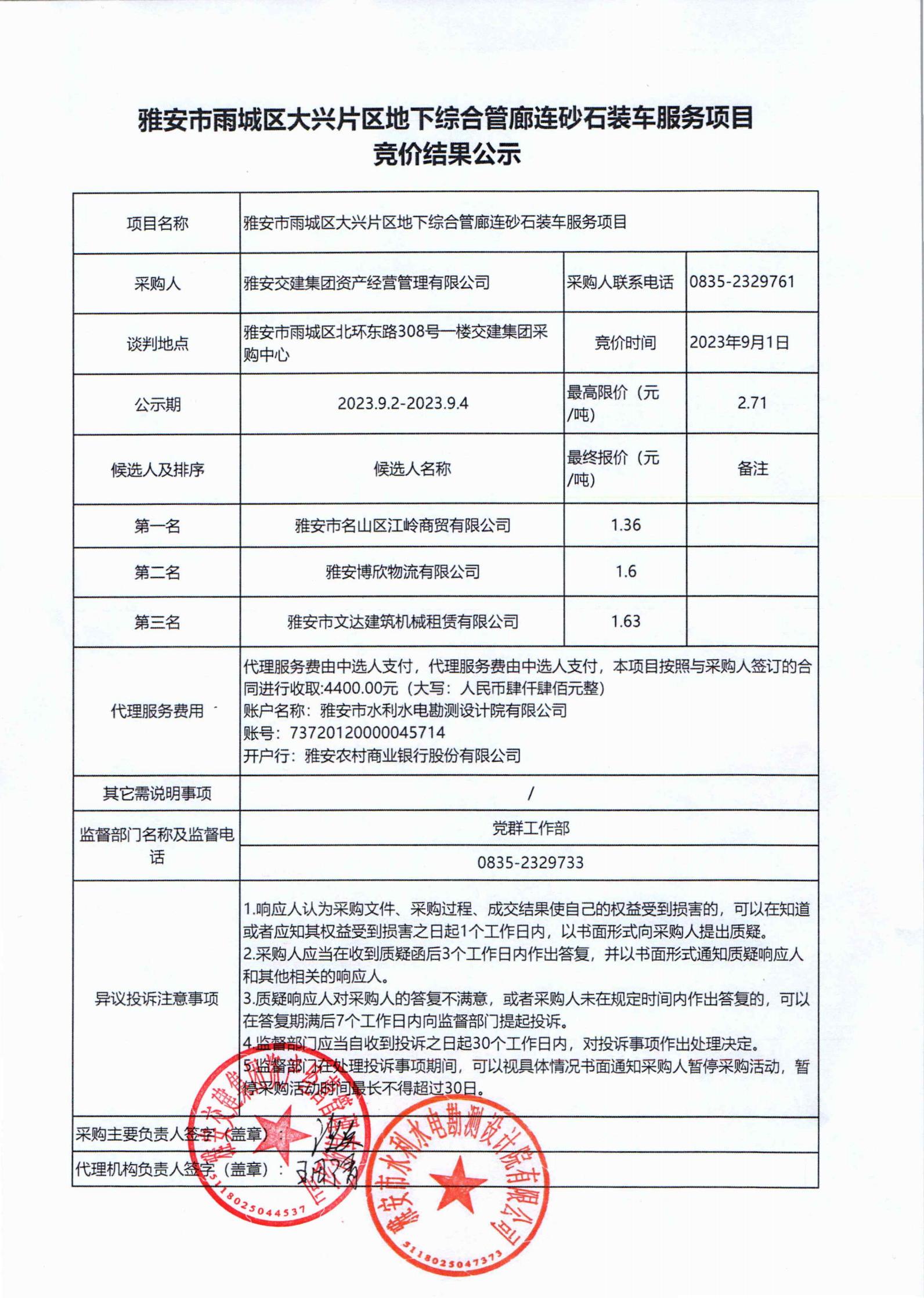 雅安交建集團(tuán)資產(chǎn)經(jīng)營管理有限公司大興片區(qū)地下綜合管廊連砂石裝車服務(wù)項(xiàng)目競(jìng)價(jià)結(jié)果公示