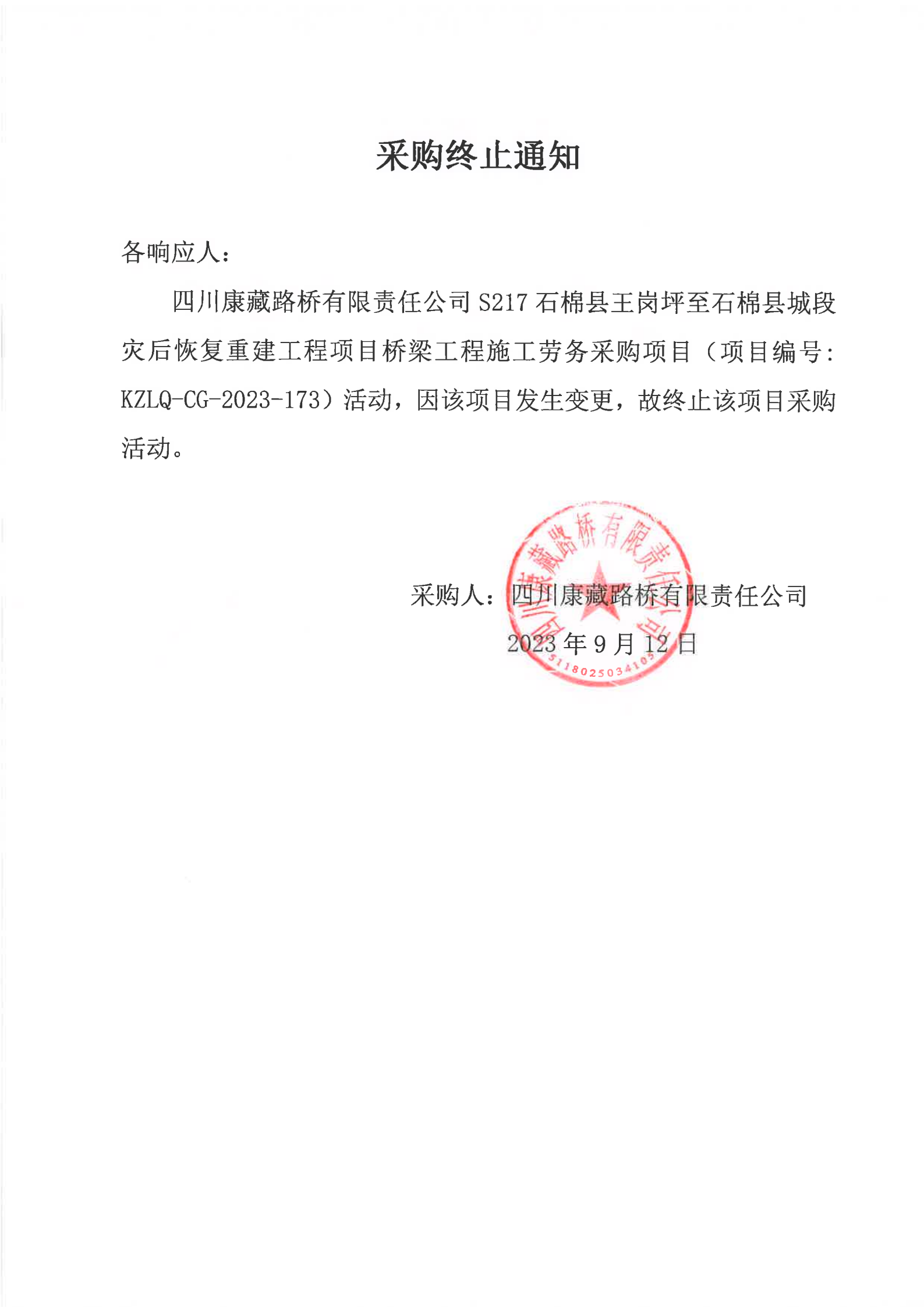 四川康藏路橋有限責(zé)任公司S217石棉縣王崗坪至石棉縣城段災(zāi)后恢復(fù)重建工程項(xiàng)目橋梁工程施工勞務(wù)項(xiàng)目采購終止通知