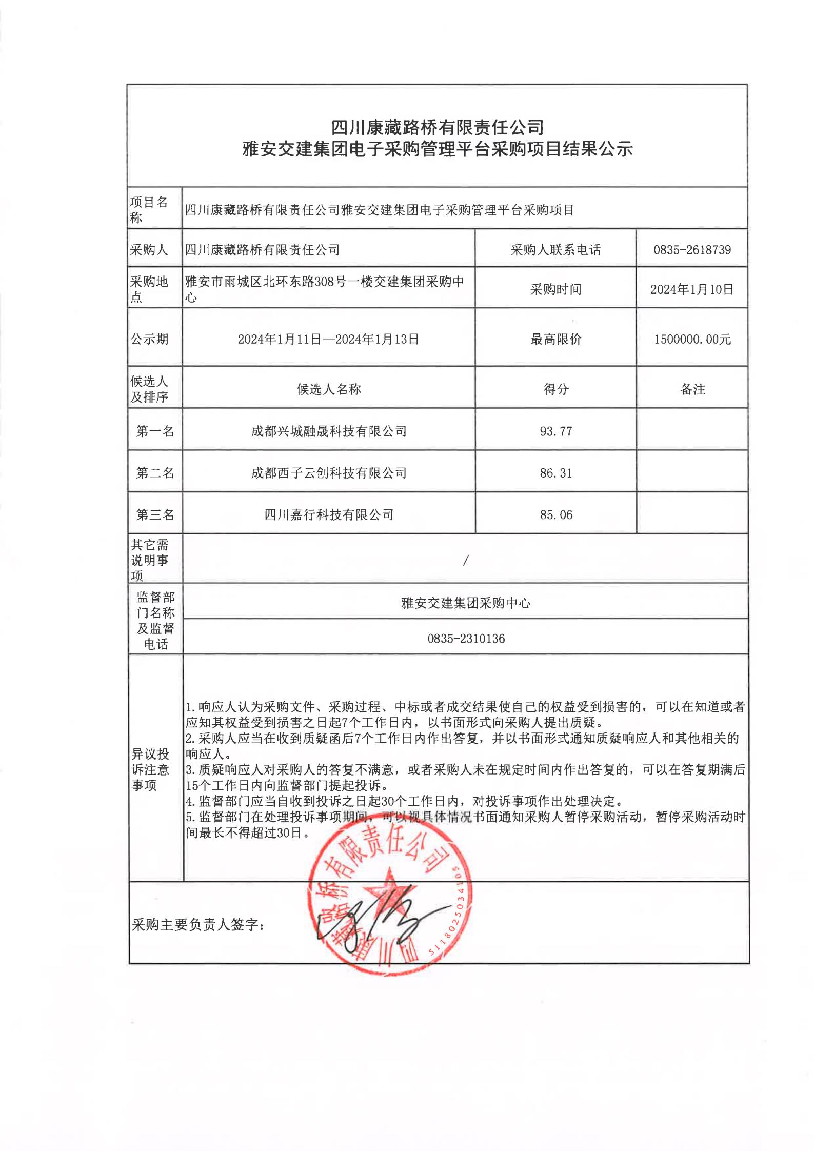 四川康藏路橋有限責(zé)任公司雅安交建集團(tuán)電子采購管理平臺采購項目結(jié)果公示