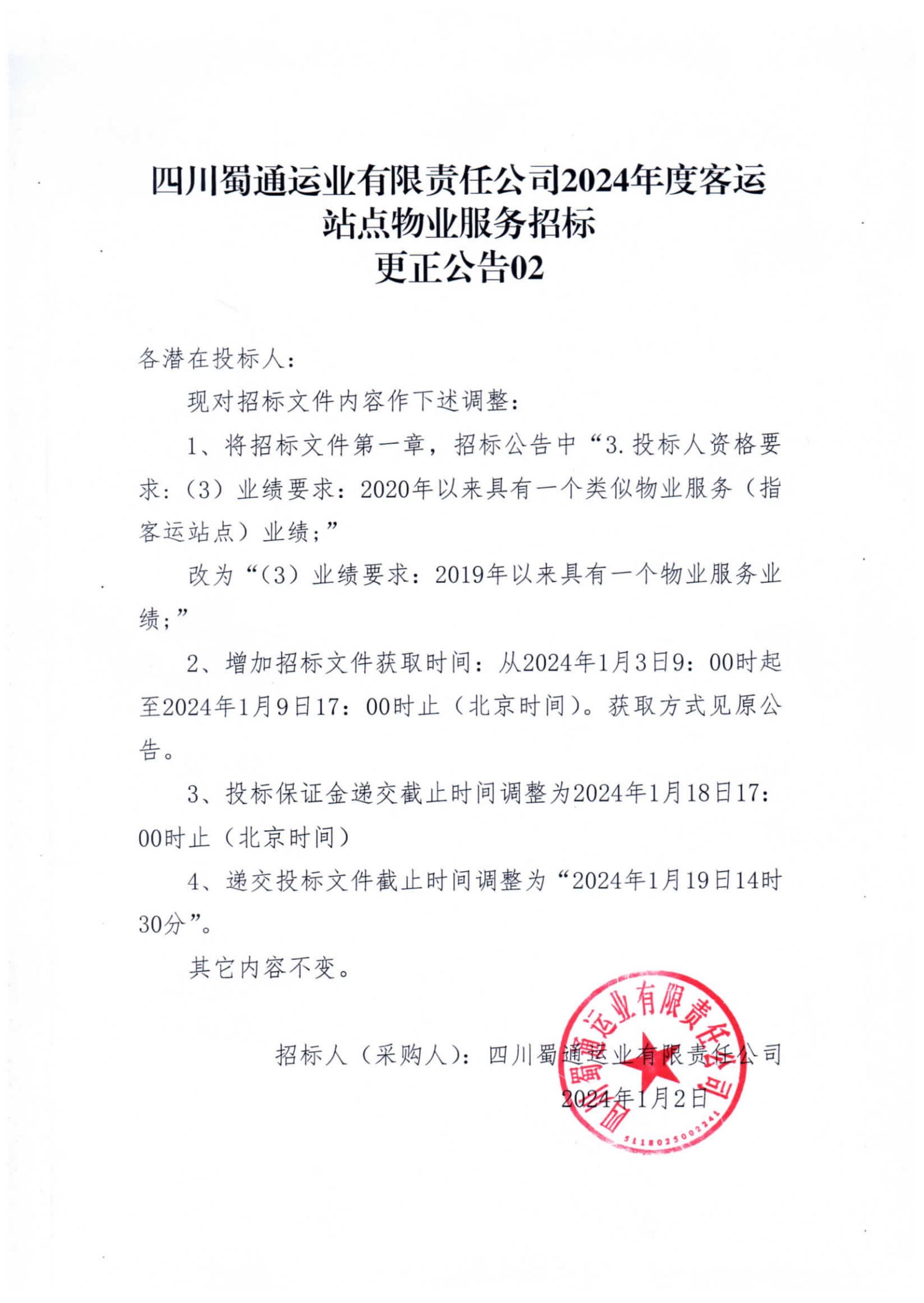 四川蜀通運業(yè)有限責(zé)任公司2024年度客運站點物業(yè)服務(wù)招標(biāo)更正公告02