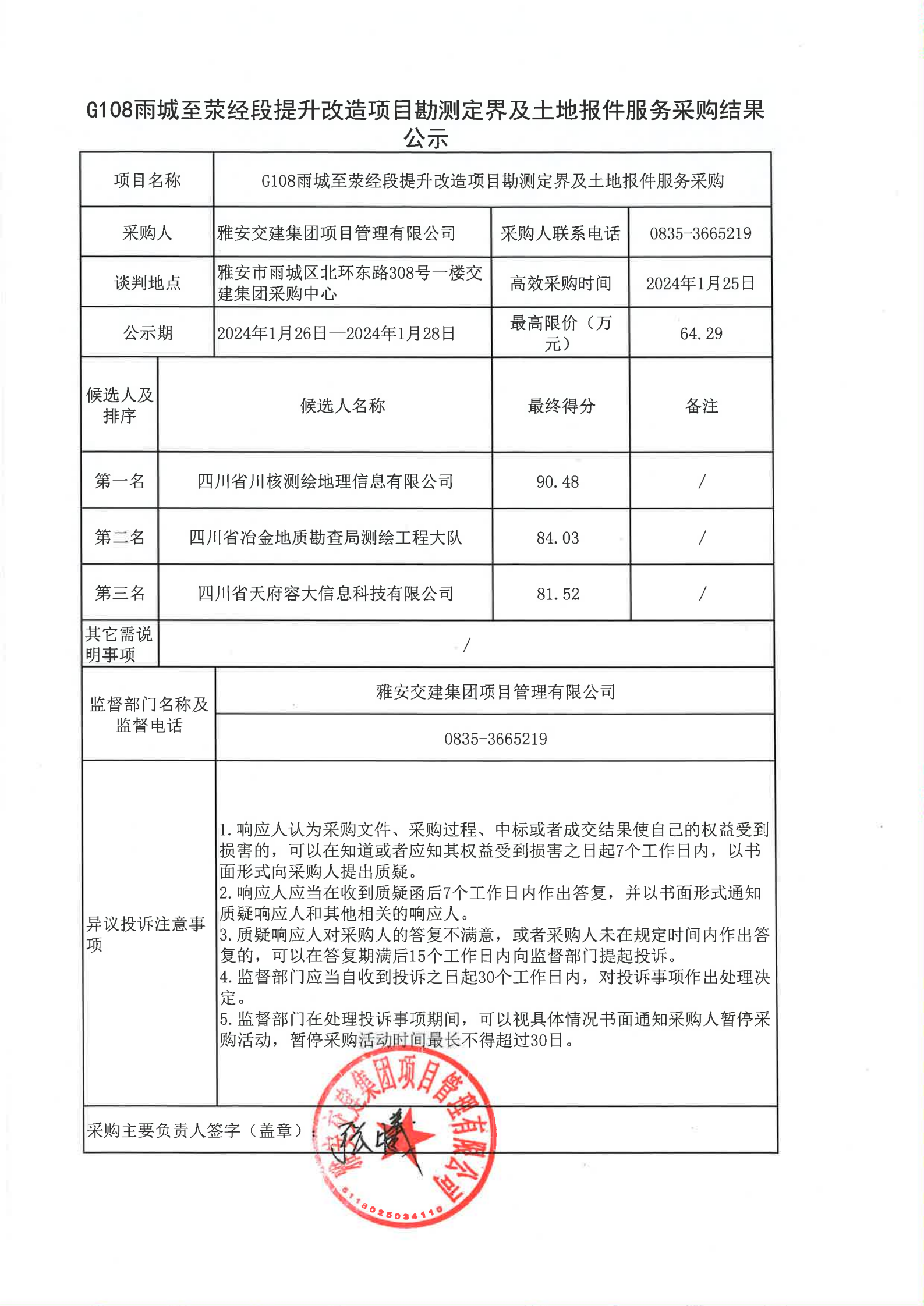 四川康藏路橋有限責(zé)任公司G108雨城至滎經(jīng)段提升改造項(xiàng)目勘測定界及土地報(bào)件服務(wù)采購結(jié)果公示
