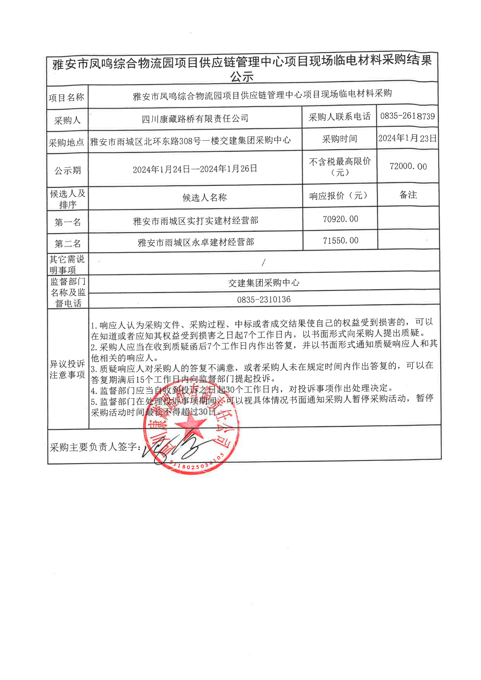 四川康藏路橋有限責(zé)任公司雅安市鳳鳴綜合物流園項(xiàng)目供應(yīng)鏈管理中心項(xiàng)目現(xiàn)場(chǎng)臨電材料采購(gòu)結(jié)果公示