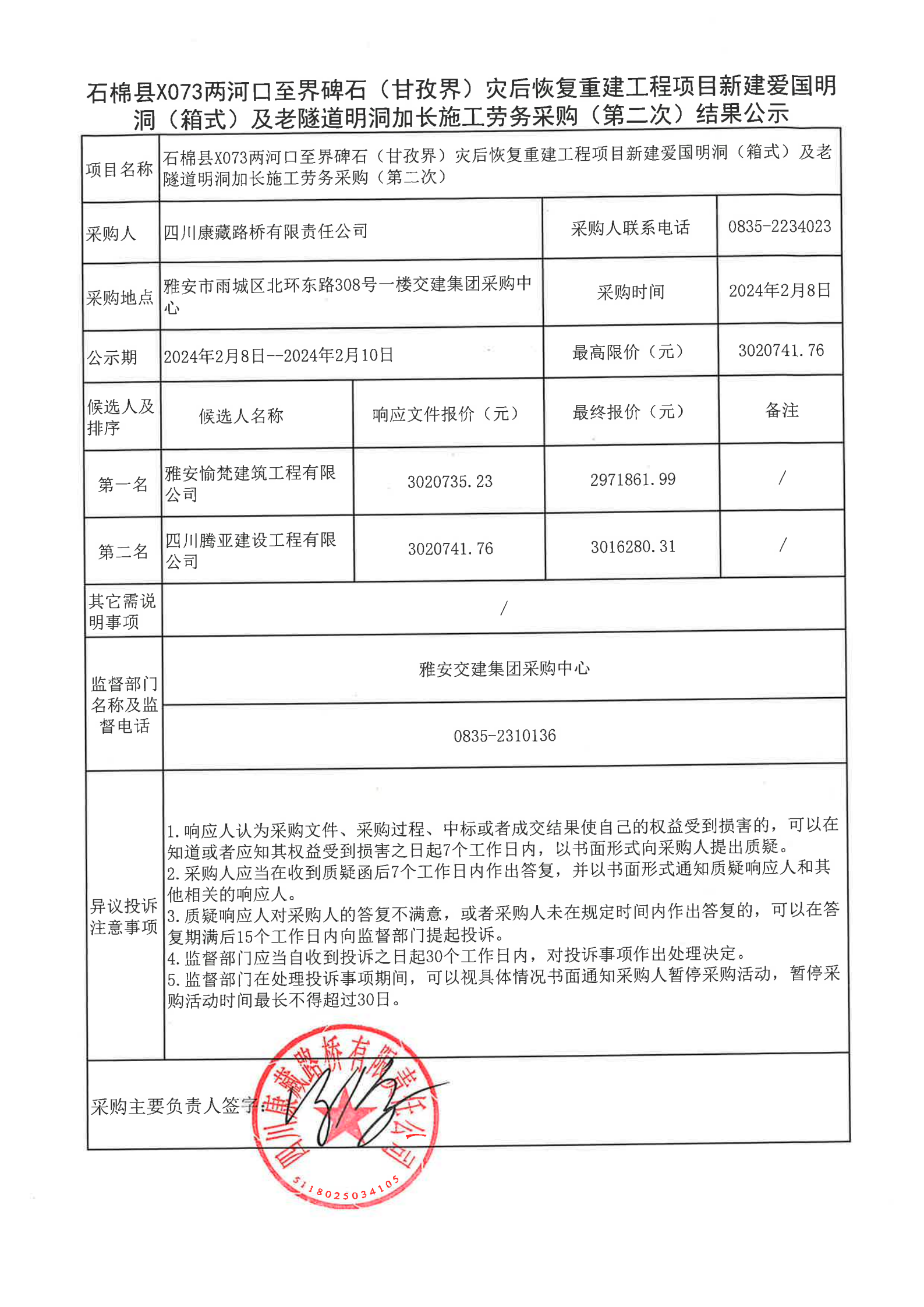 四川康藏路橋有限責(zé)任公司石棉縣X073兩河口至界碑石(甘孜界)災(zāi)后恢復(fù)重建工程項(xiàng)目新建愛國明洞(箱式)及老隧道明洞加長施工勞務(wù)采購(第二次)結(jié)果公示