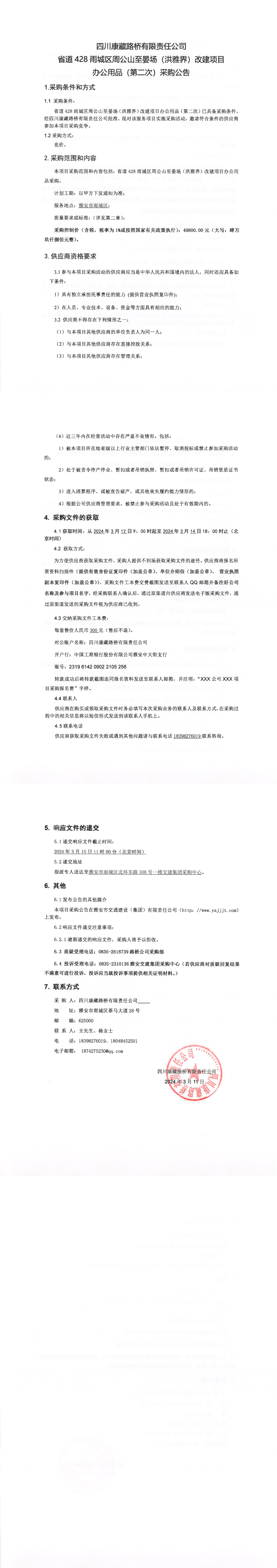 四川康藏路橋有限責(zé)任公司省道428雨城區(qū)周公山至晏場(洪雅界)改建項目辦公用品(第二次)采購公告