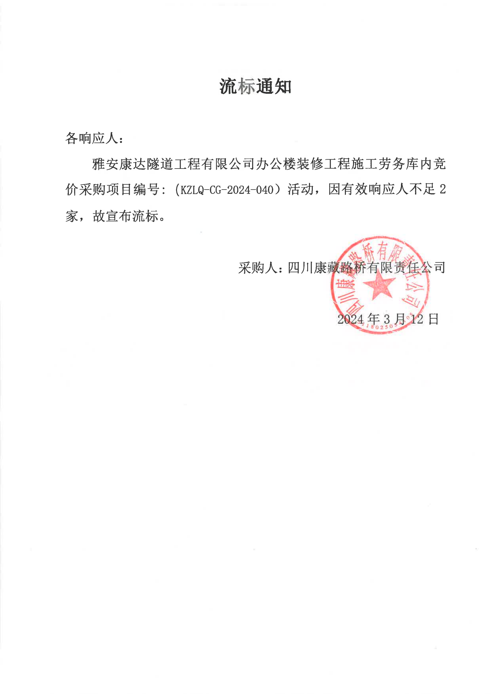 雅安康達(dá)隧道工程有限公司辦公樓裝修工程施工勞務(wù)庫內(nèi)競價采購流標(biāo)通知