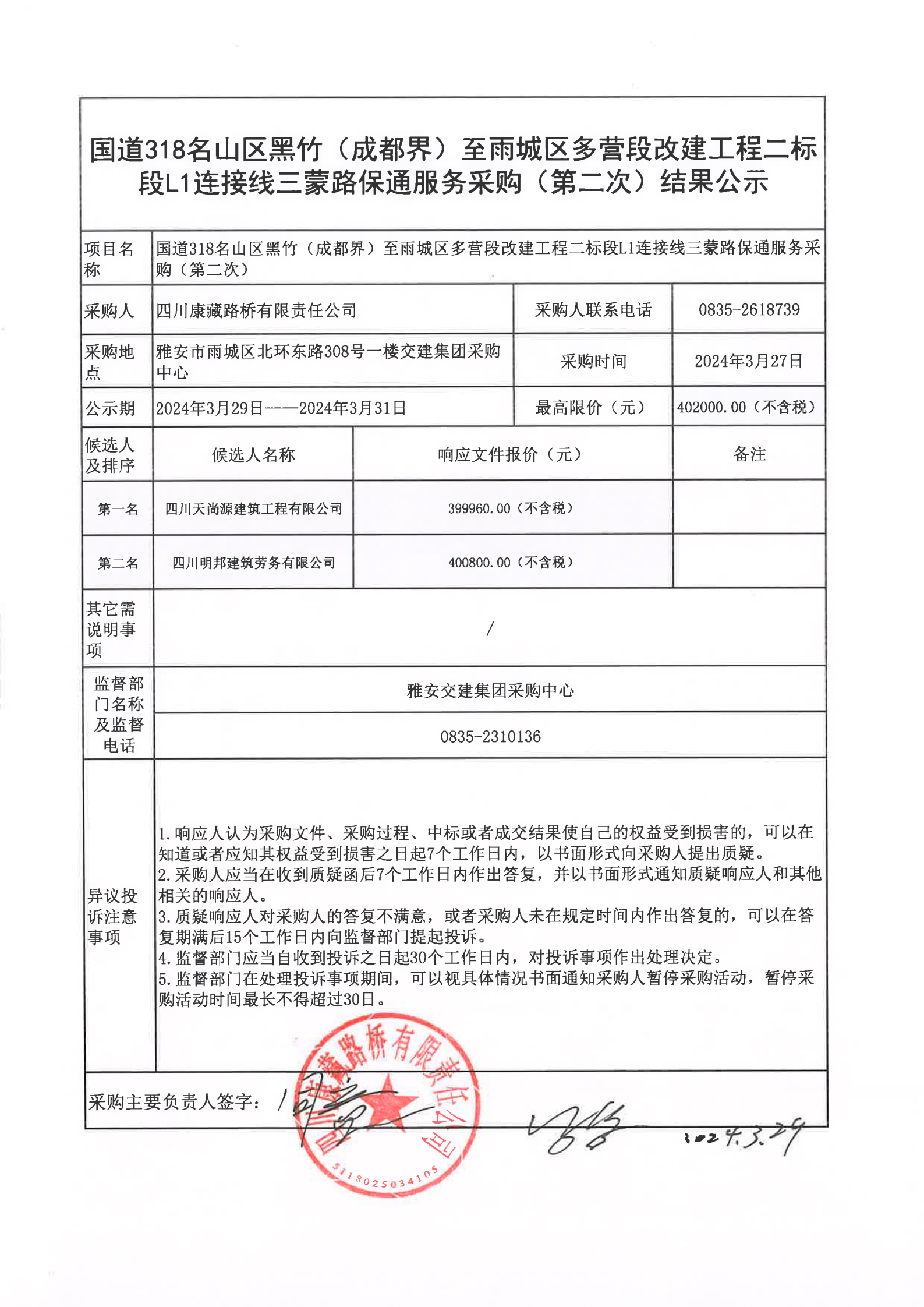 四川康藏路橋有限責(zé)任公司國道318名山區(qū)黑竹(成都界)至雨城區(qū)多營段改建工程二標(biāo)段L1連接線三蒙路保通服務(wù)(第二次)結(jié)果公示