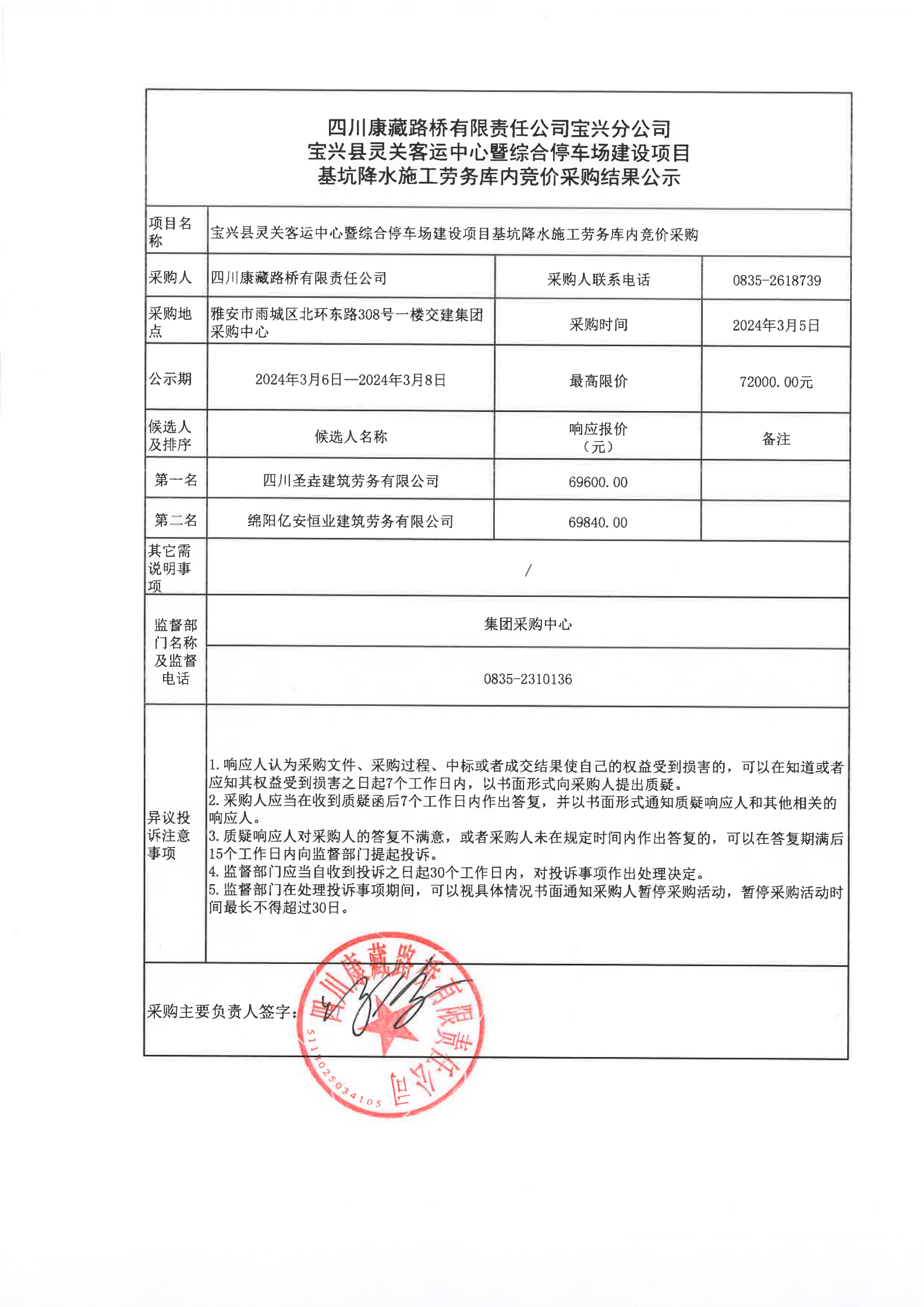 四川康藏路橋有限責(zé)任公司寶興分公司寶興縣靈關(guān)客運(yùn)站中心暨綜合停車場建設(shè)項(xiàng)目基坑降水施工勞務(wù)庫內(nèi)競價采購結(jié)果公示