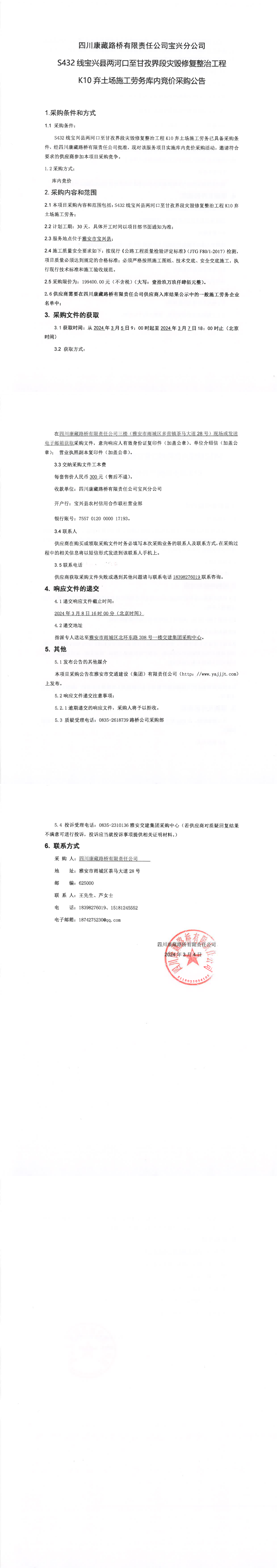 四川康藏路橋有限責(zé)任公司S432線寶興縣兩河口至甘孜界段災(zāi)毀修復(fù)整治工程K10棄土場施工勞務(wù)庫內(nèi)競價(jià)采購公告