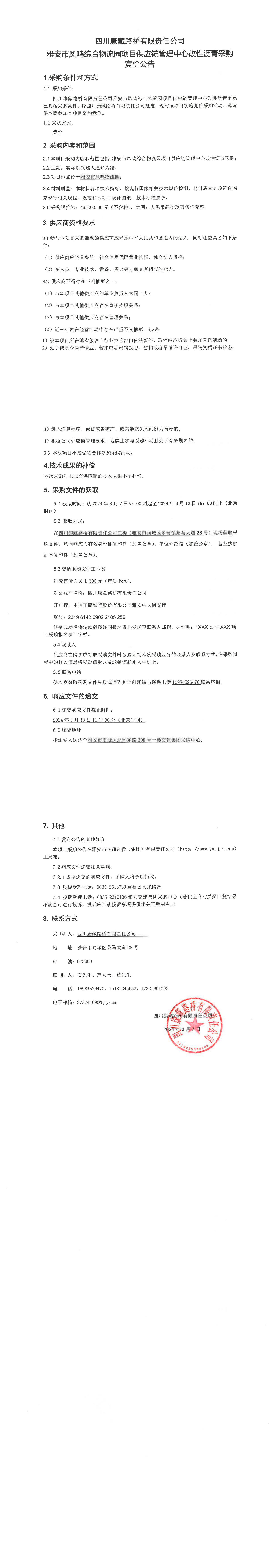 四川康藏路橋有限責(zé)任公司雅安市鳳鳴綜合物流園項(xiàng)目供應(yīng)鏈管理中心改性瀝青采購競價公告