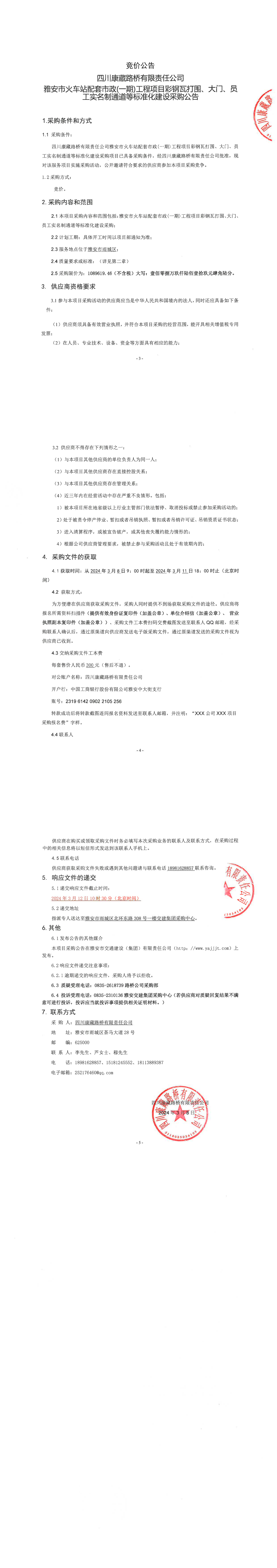 四川康藏路橋有限責(zé)任公司雅安市火車站配套市政(一期)工程項目彩鋼瓦打圍、大門、員工實名制通道等標(biāo)準(zhǔn)化建設(shè)采購公告