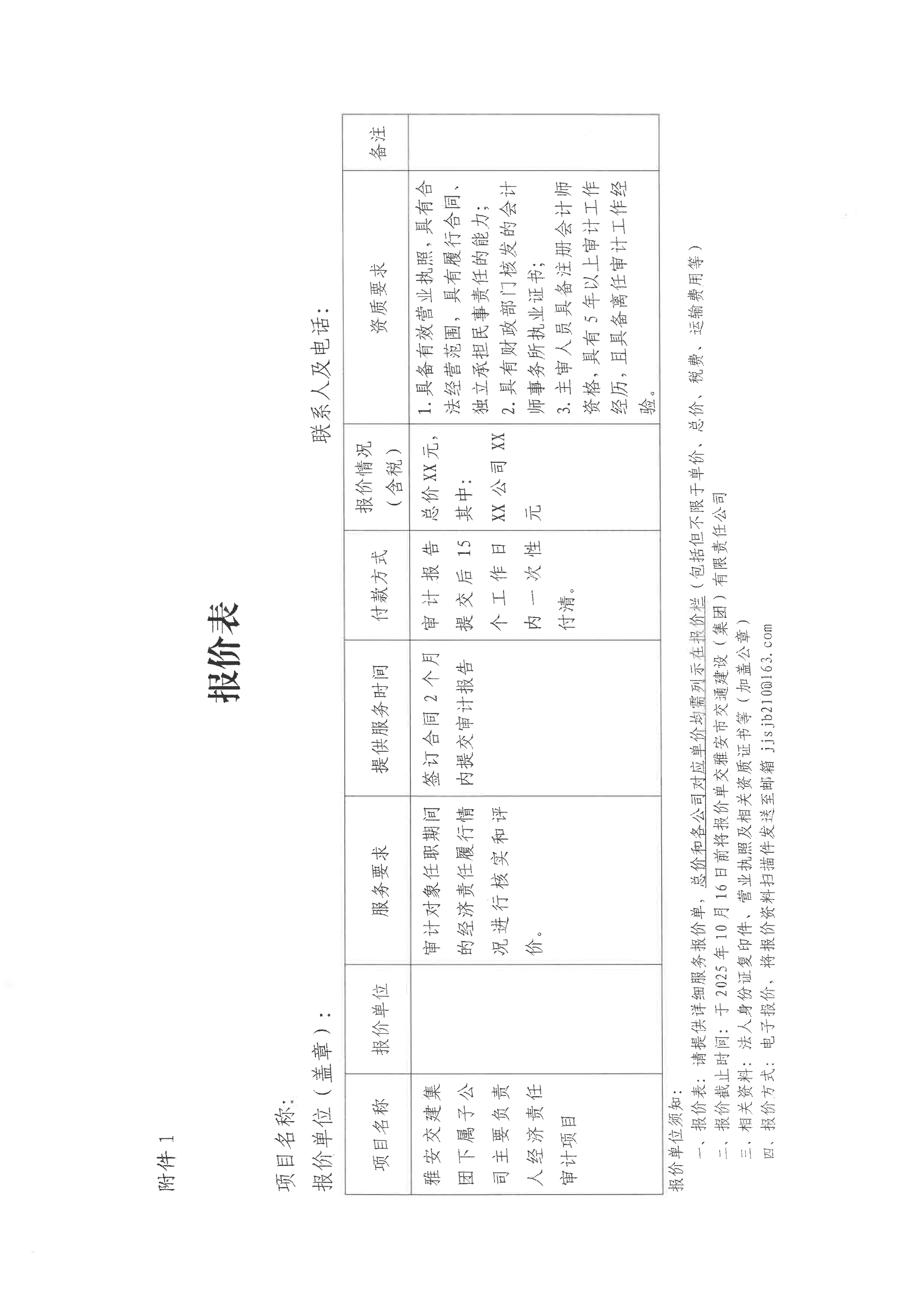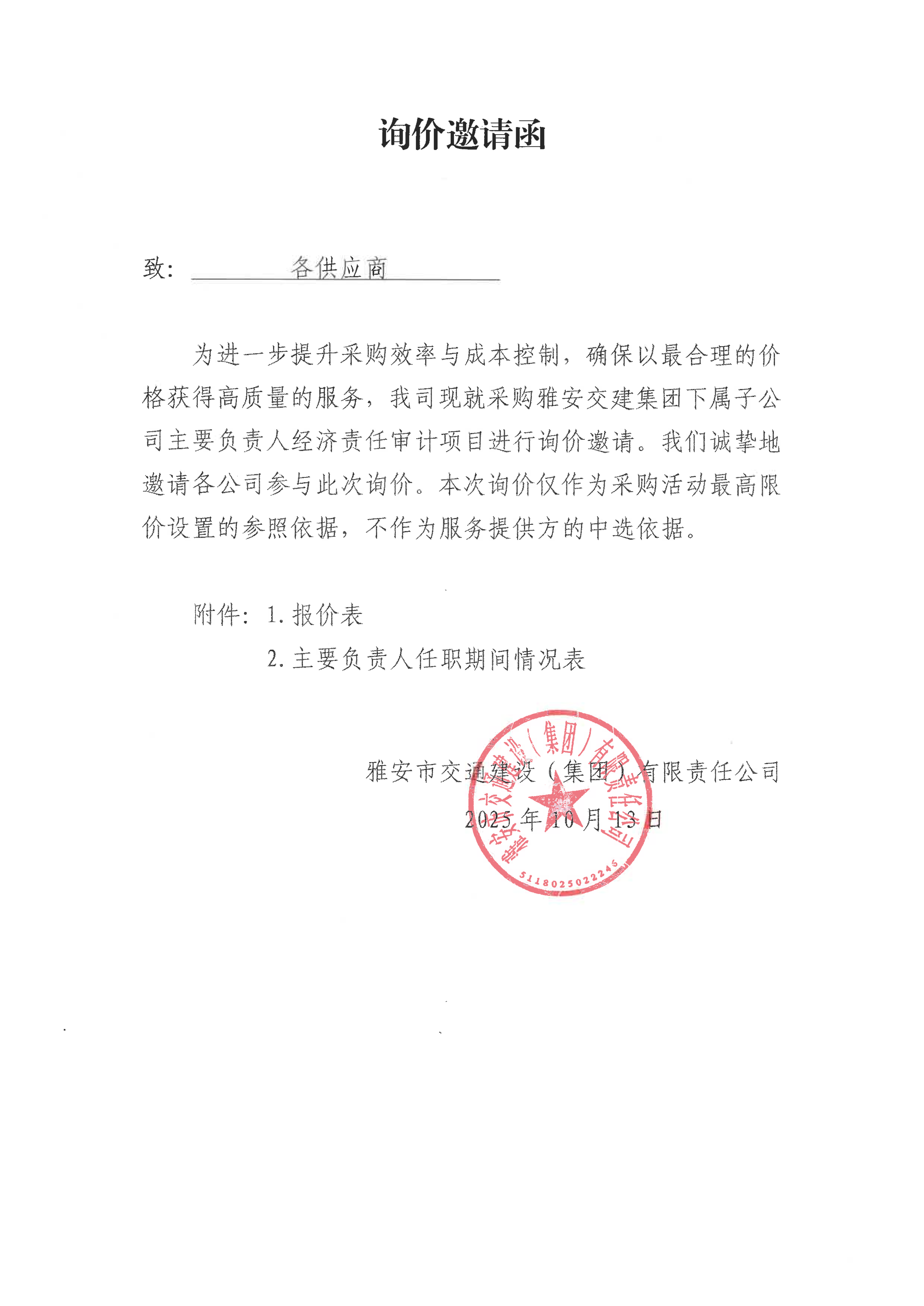 關于雅安交建集團下屬子公司主要負責人經(jīng)濟責任審計項目限價的詢價函