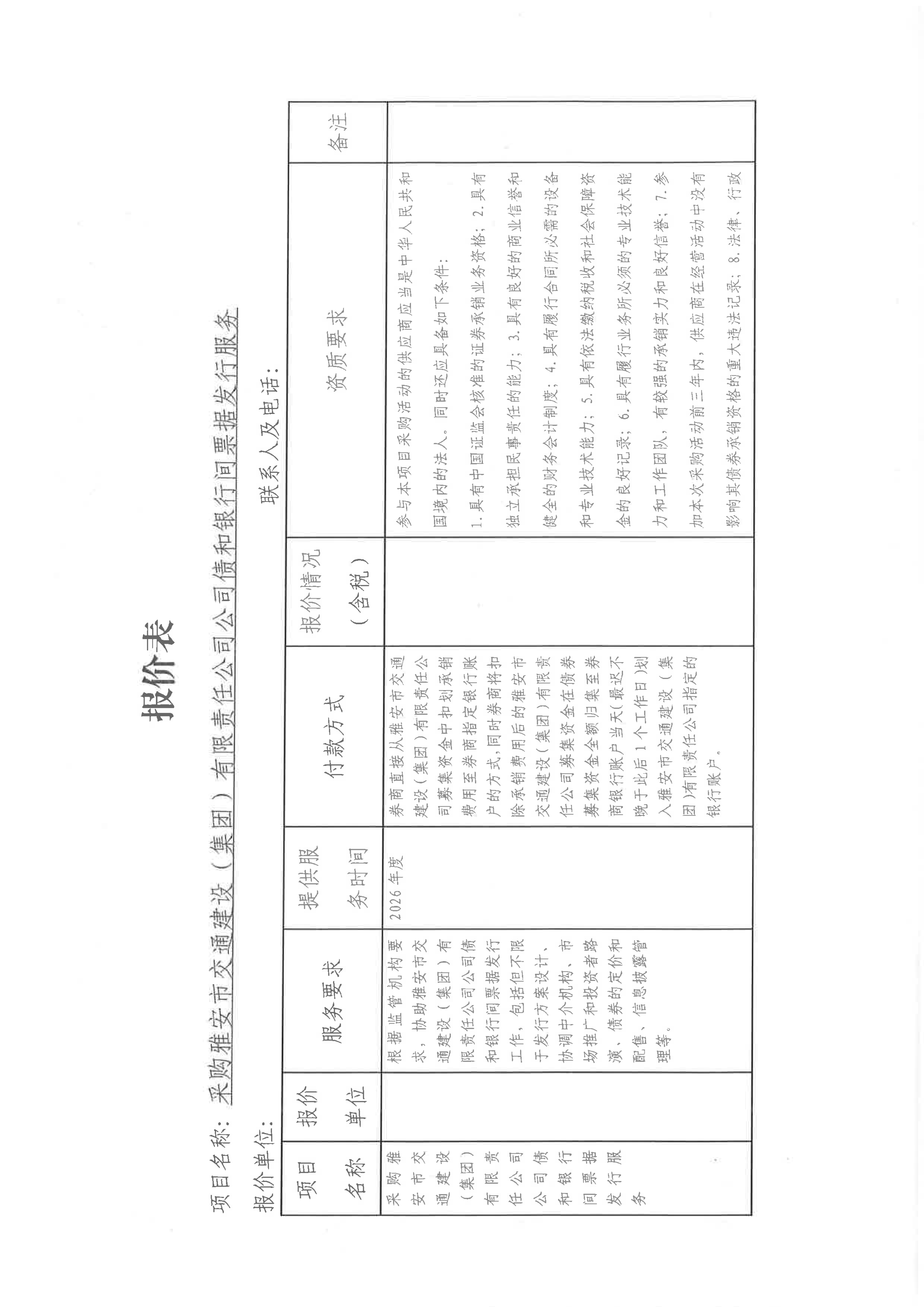 關(guān)于采購雅安市交通建設(shè)(集團)有限責任公司發(fā)行公司債和發(fā)行銀行間票據(jù)所需券商服務限價的詢價函