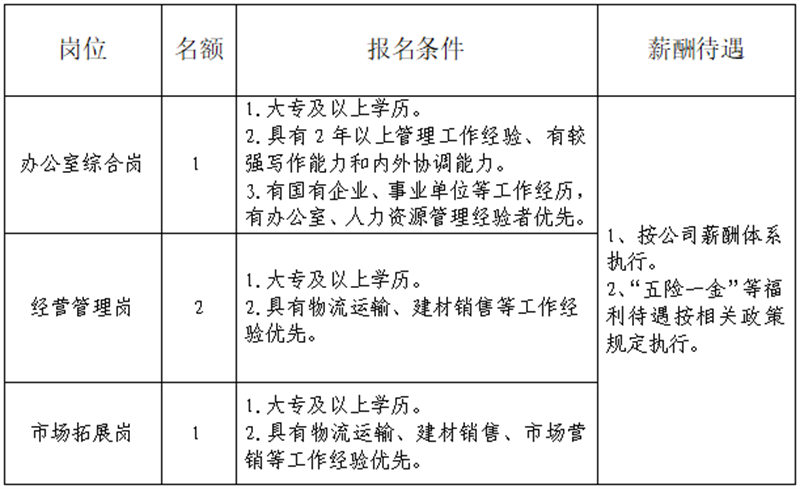雅安交建集團運通貿(mào)易有限公司是雅安市交通建設(shè)(集團)有限責任公司下屬子公司。主要從事普通貨運、建材銷售、供應鏈管理、貨運代理、貨運信息咨詢服務、倉儲配送服務等工作。現(xiàn)根據(jù)公司業(yè)務發(fā)展需要,決定招聘4名工作人員,現(xiàn)將有關(guān)事項公告如下: