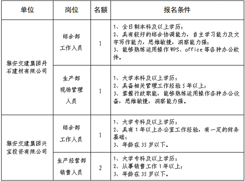 根據(jù)發(fā)展需要,決定面向社會公開招聘雅安市交通建設(集團)有限責任公司(以下簡稱“雅安交建集團”)所屬子公司工作人員5名,現(xiàn)將有關事項公告如下:
