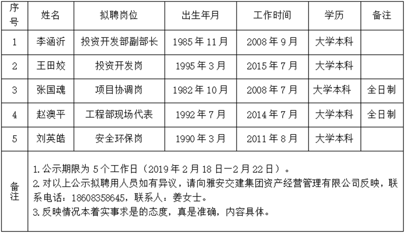 通過(guò)公開(kāi)報(bào)名、資格審查、筆試、面試等程序,經(jīng)雅安交建集團(tuán)資產(chǎn)經(jīng)營(yíng)管理有限公司研究,對(duì)以下5名擬聘用人員予以公示: