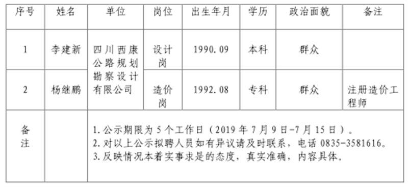 雅安交建集團(tuán)子公司擬聘用人員公示 (勘察設(shè)計公司)