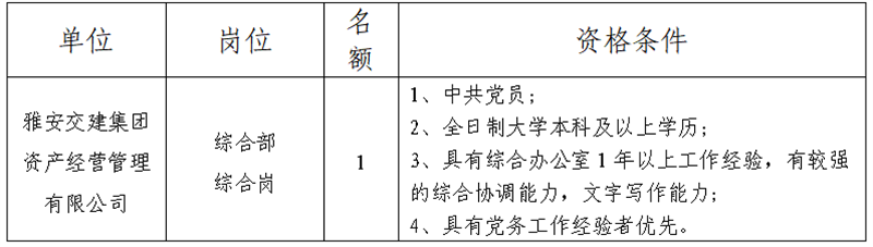 根據(jù)發(fā)展需要,決定面向社會公開招聘雅安市交通建設(shè)(集團(tuán))有限責(zé)任公司(以下簡稱“雅安交建集團(tuán)”)所屬子一般工作人員1名,現(xiàn)將有關(guān)事項公告如下: