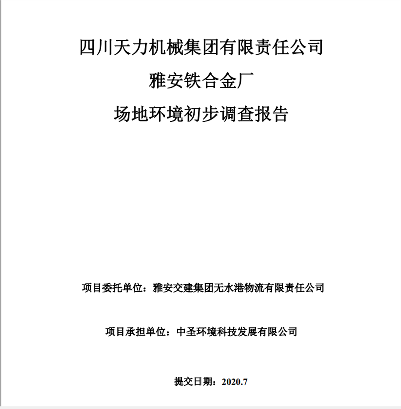 四川天力機(jī)械集團(tuán)有限責(zé)任公司——雅安鐵合金廠場(chǎng)地環(huán)境初步調(diào)查報(bào)告