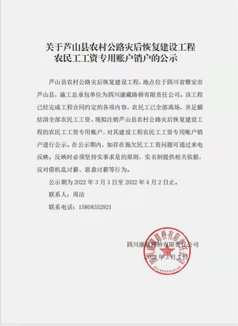 關于蘆山縣農村公路災后恢復建設工程 農民工工資專用賬戶銷戶的公示