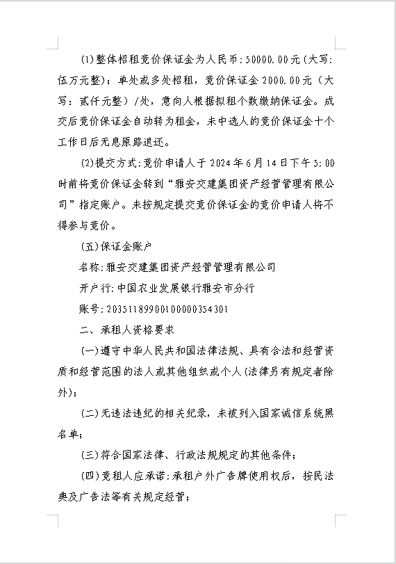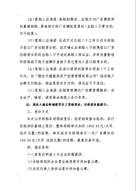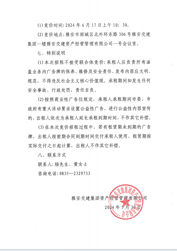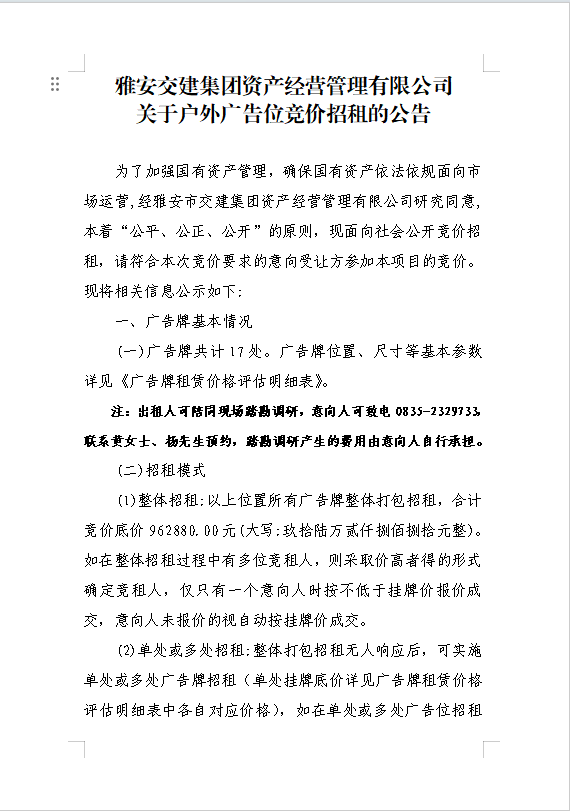 雅安交建集團(tuán)資產(chǎn)經(jīng)營管理有限公司關(guān)于戶外廣告位競價(jià)招租的公告