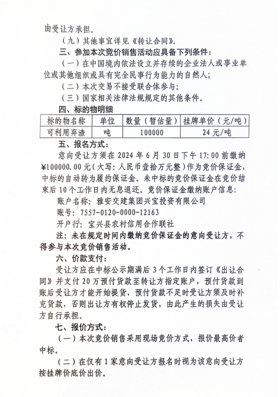雅安交建集團(tuán)興寶投資有限公司寶興縣靈關(guān)鎮(zhèn)代碑寺土地整理項(xiàng)目10萬(wàn)噸可利用棄渣競(jìng)價(jià)銷售公告(2024.6.27)