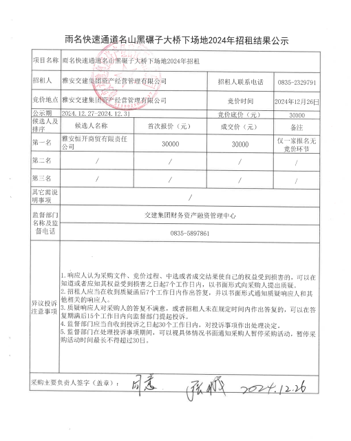 雨名快速通道名山黑碾子大橋下場地2024年招租結(jié)果公示