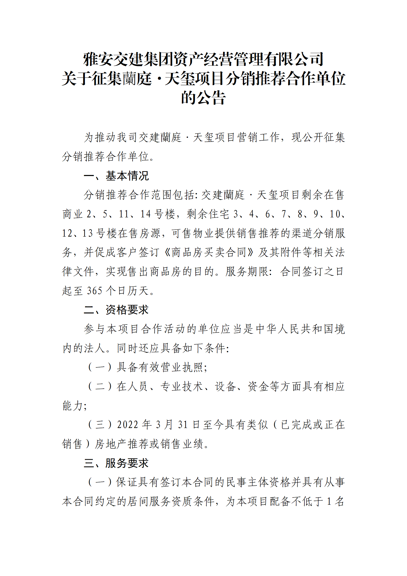 雅安交建集團資產(chǎn)經(jīng)營管理有限公司 關(guān)于征集蘭庭·天璽項目分銷推薦合作單位的公告