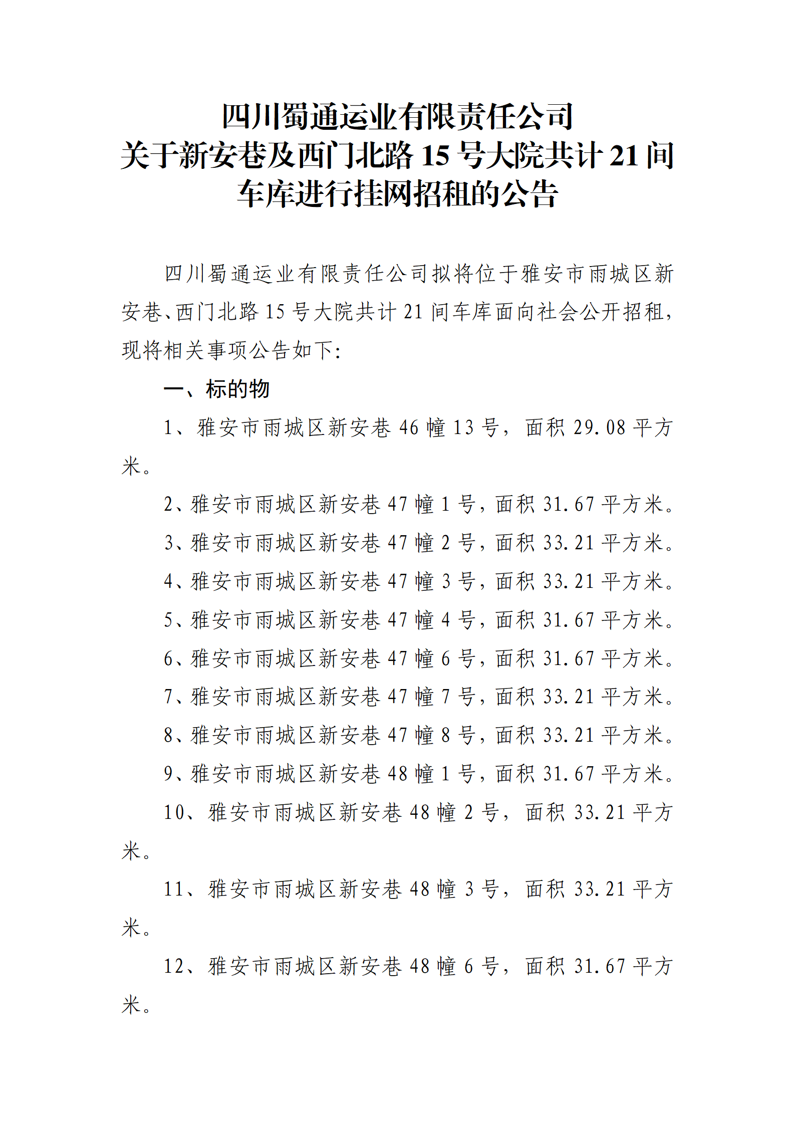 四川蜀通運業(yè)有限責任公司 關于新安巷及西門北路15號大院共計21間車庫進行掛網(wǎng)招租的公告