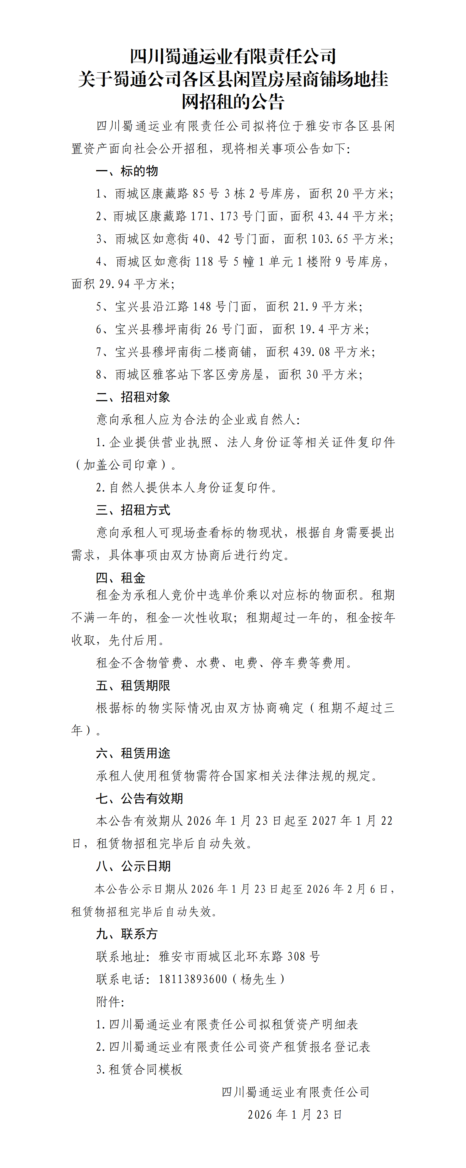 四川蜀通運(yùn)業(yè)有限責(zé)任公司關(guān)于蜀通公司各區(qū)縣閑置房屋商鋪場地掛網(wǎng)招租的公告