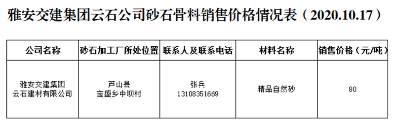 ÑŰ²½»½¨¼¯ˆF(tu¨¢n)ÔÆÊ¯¹«Ë¾É°Ê¯¹ÇÁÏäNÊÛƒr(ji¨¤)¸ñÇé›r±í£¨2020.10.17£©