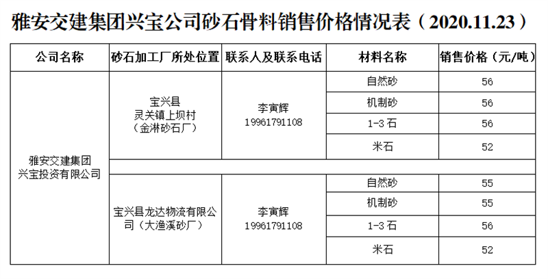 雅安交建集團(tuán)興寶公司砂石骨料銷售價格情況表(2020.11.23)