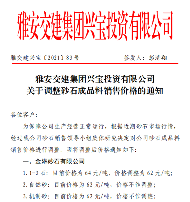 雅安交建集團(tuán)興寶公司關(guān)于調(diào)整成品料銷(xiāo)售價(jià)格的通知(2021.11.26)