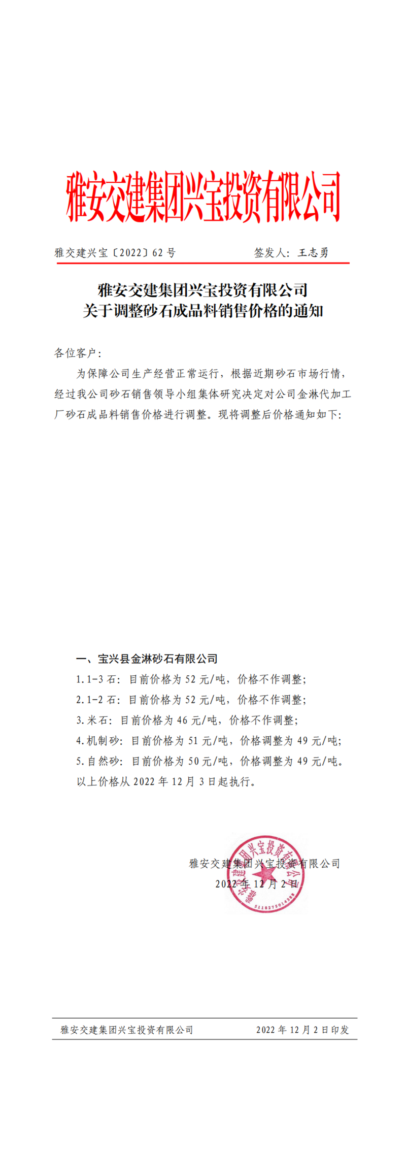 ÑŽ»½¨ÅdŒš¡²2022¡³62Ì–(h¨¤o) êP(gu¨¡n)ÓÚÕ{(di¨¤o)Õûɰʯ³ÉÆ·ÁÏäNÊÛƒr(ji¨¤)¸ñµÄ֪ͨ£¨2022-12-2£©