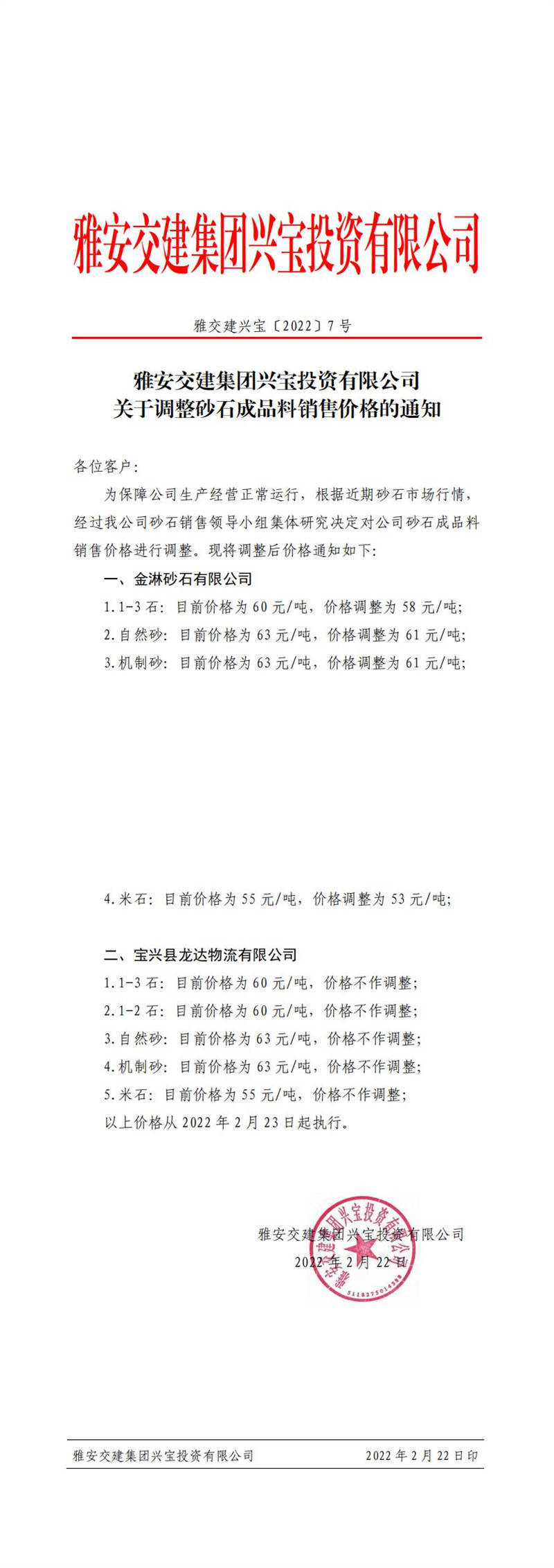 ÑŰ²½»½¨¼¯ˆFÅdŒšÍ¶ÙYÓÐÏÞ¹«Ë¾ êP(gu¨¡n)ÓÚÕ{(di¨¤o)Õûɰʯ³ÉÆ·ÁÏäNÊÛƒr¸ñµÄ֪ͨ£¨2022-2-23£©