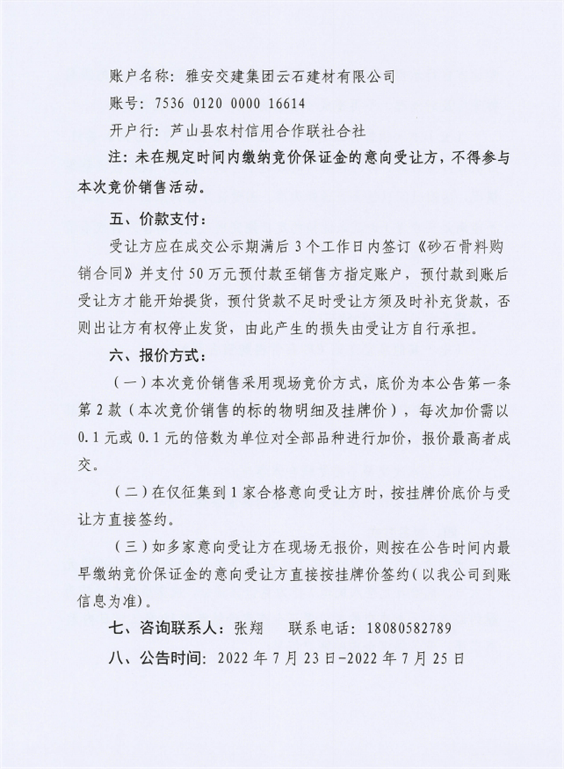 雅安交建集團云石建材有限公司成品料競價銷售公告