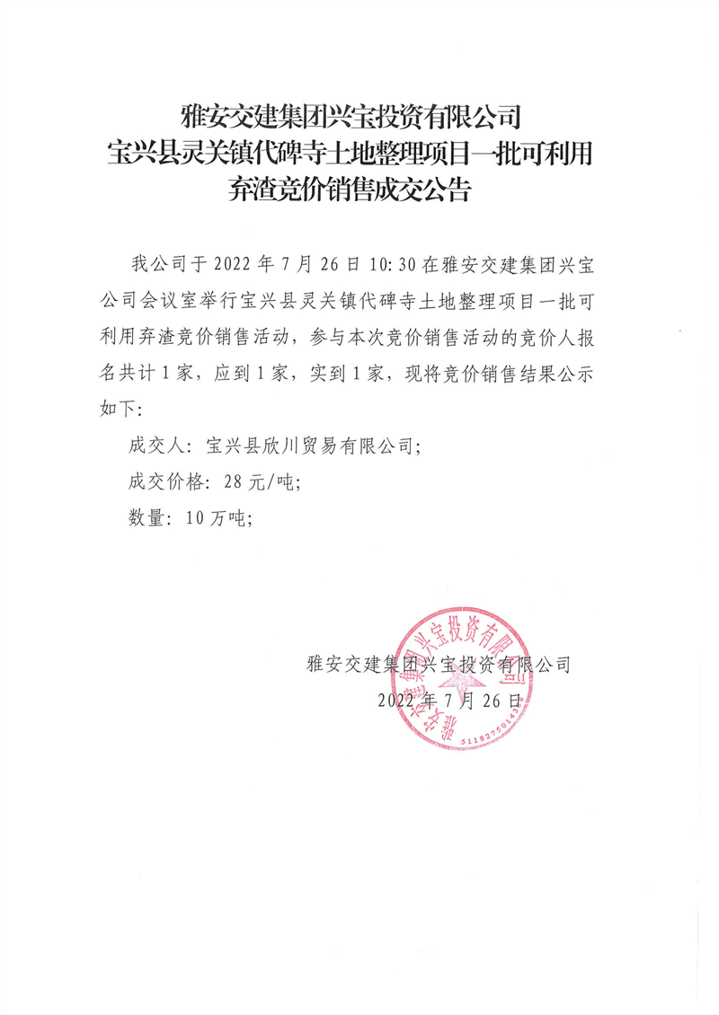寶興縣靈關鎮(zhèn)代碑寺土地整理項目一批可利用棄渣競價銷售成交公告7.26(5萬噸)
