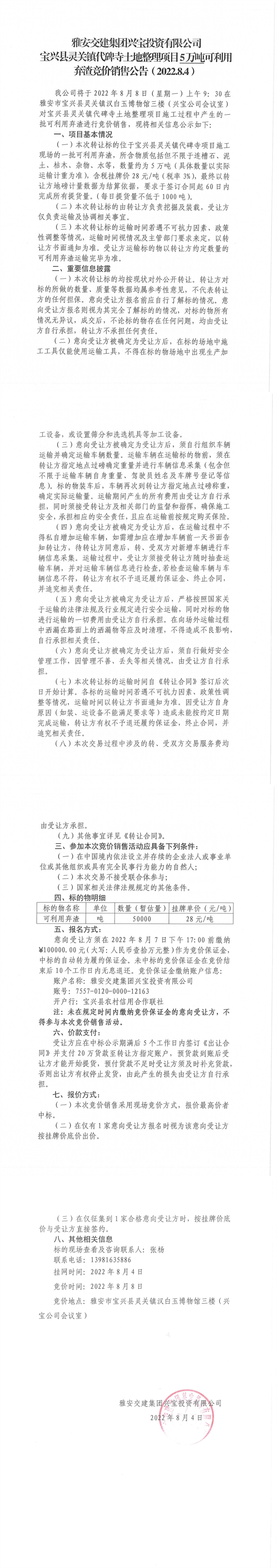 雅安交建集團(tuán)興寶投資有限公司靈關(guān)鎮(zhèn)代碑寺土地整理項(xiàng)目5萬噸可利用棄渣競價(jià)銷售公告(2022.8.4)